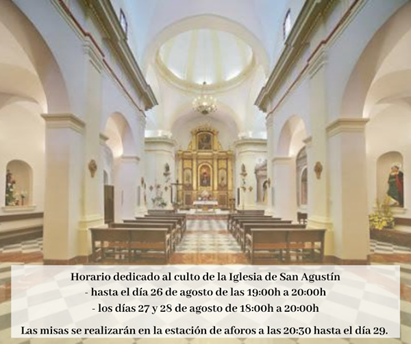 A petición del Cura Parroco Don Antonio Guillen Campillo os informamos que la Iglesia de San Agustín permanecerá abierta para el culto todos los días de las 19:00h a 20:00h y los días 27 y 28 de agosto de 18:00h a 20:00h.